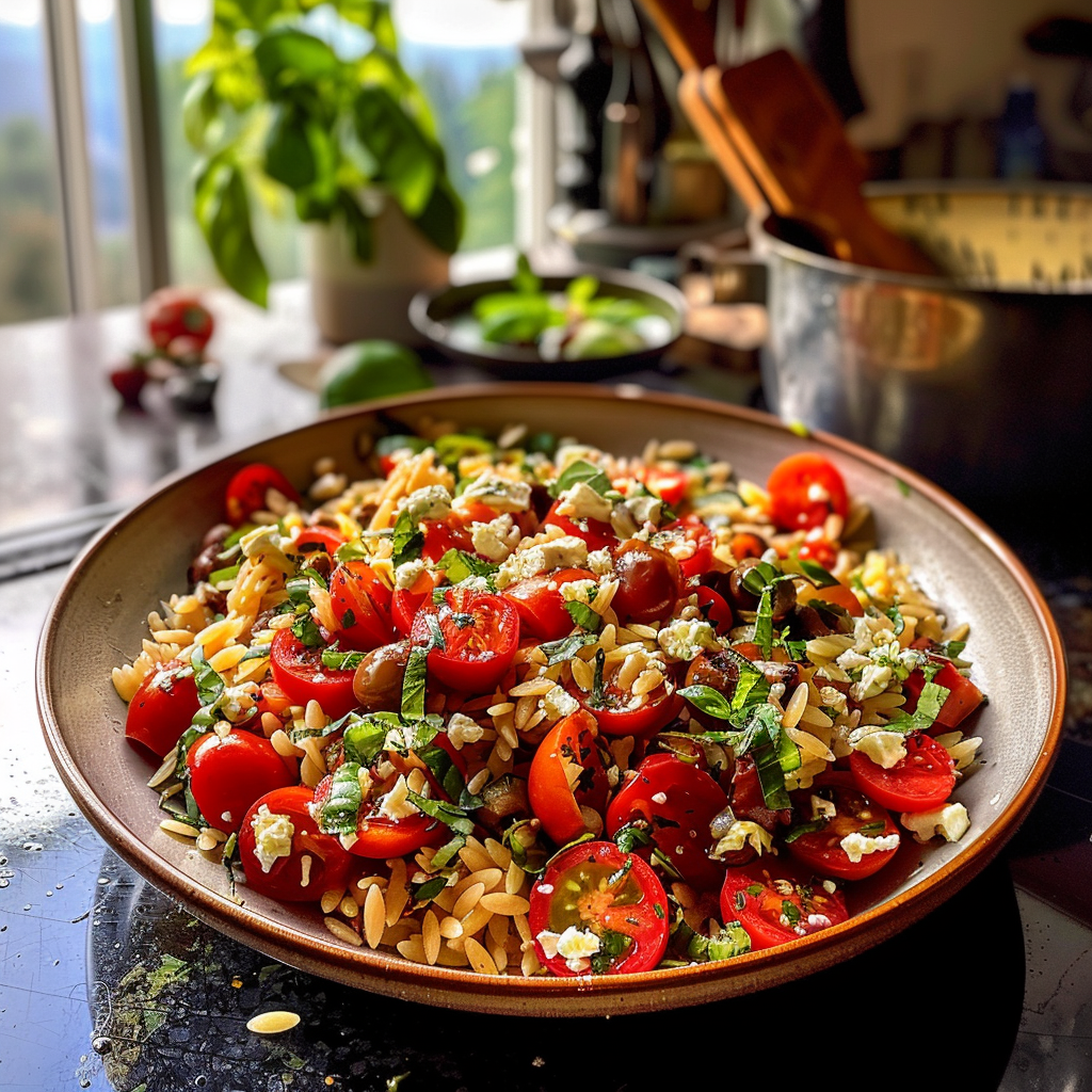 Irresistible Greek Roasted Red Pepper Tomato Feta Orzo