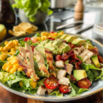 Assemble Your Salad: In a large bowl, layer mixed greens as the base. Add sliced chicken, crispy bacon bits, diced avocado, halved cherry tomatoes, and chopped eggs on top.