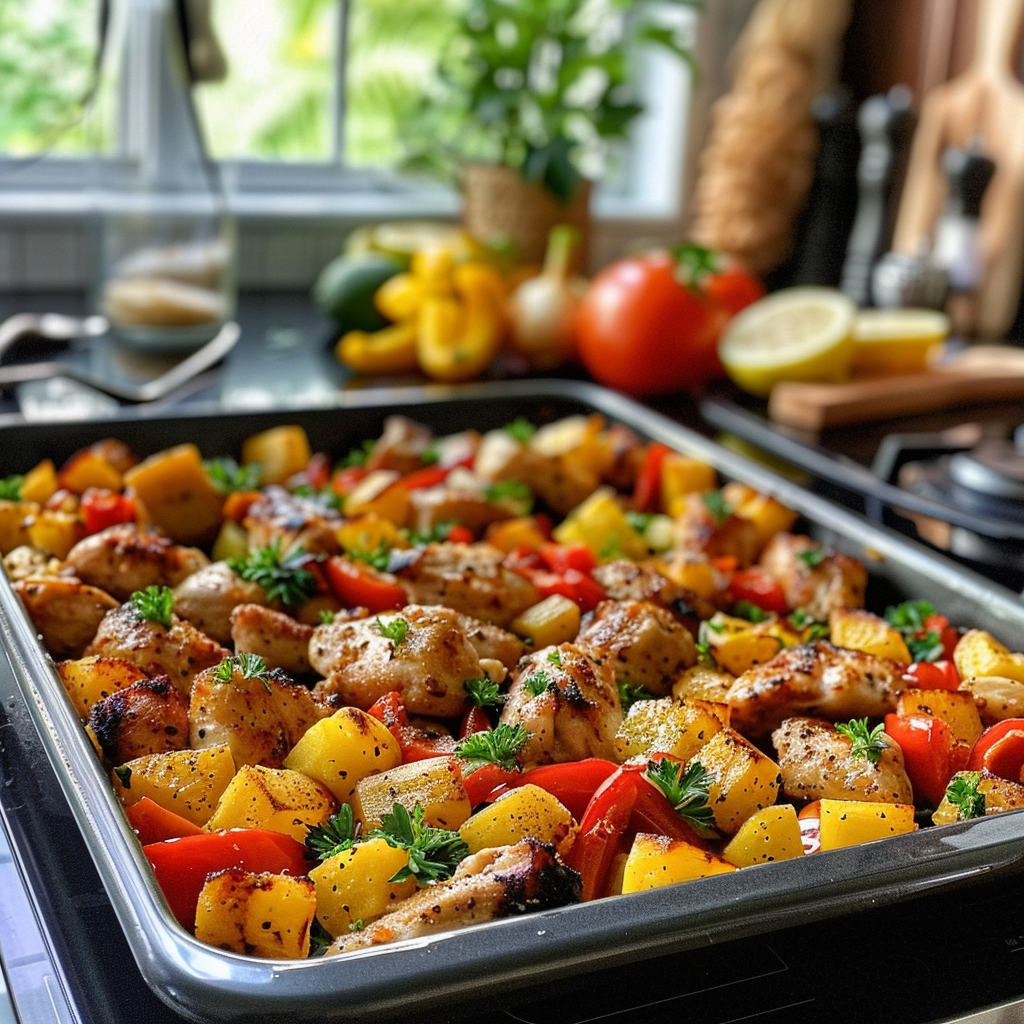 Assemble on a Sheet Pan: Arrange marinated chicken in the center of a large baking sheet. Surround it with chopped veggies and pineapple chunks for an eye-catching display.